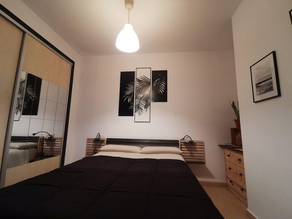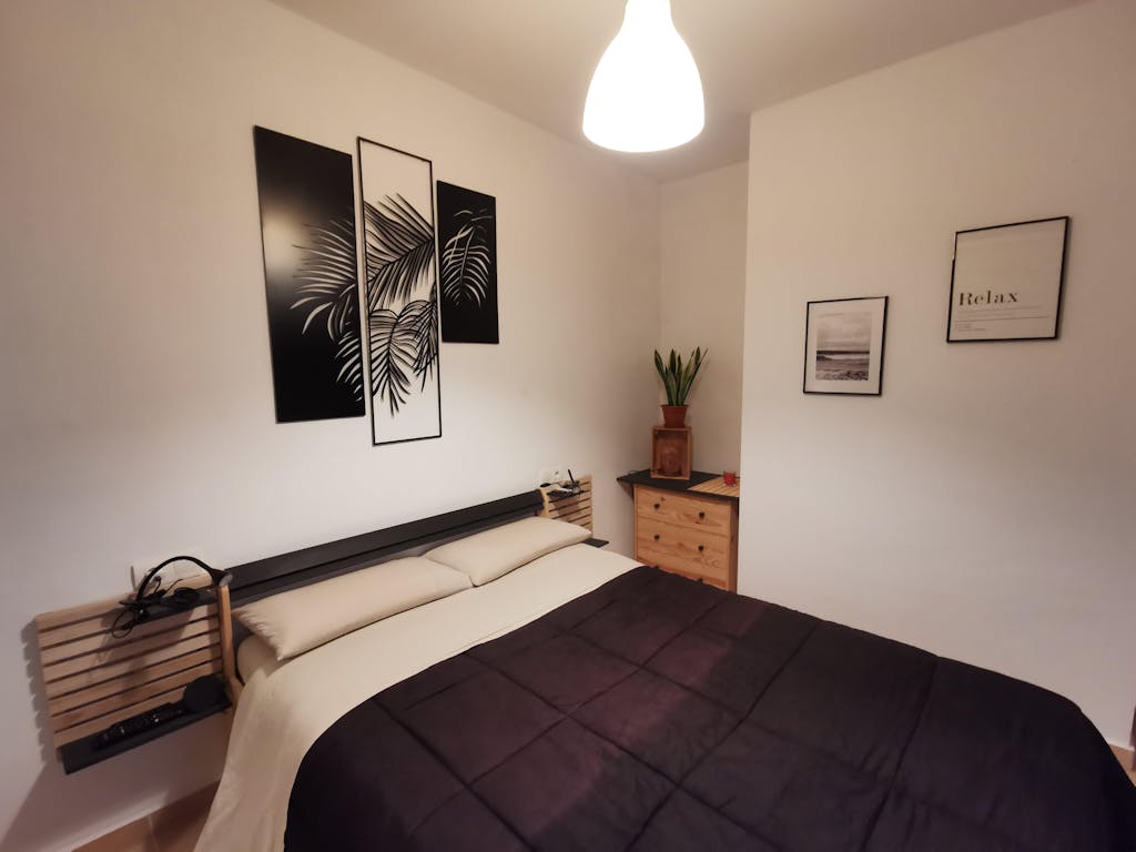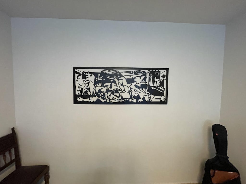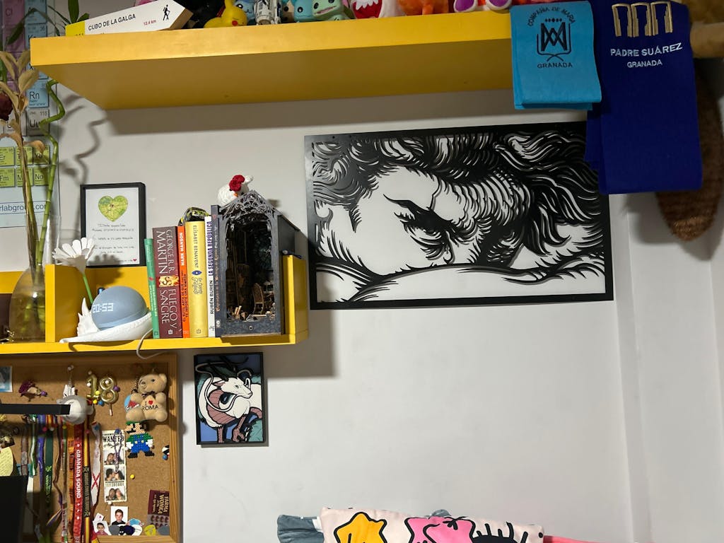 Queda muy chulo colgado en la pared, al no quedar pegado a la pared, con ese centímetro que hay de distancia entre la pared y el cuadro, y la luz entrando por la ventana de la habitación, hace un efecto de sombra que hace que quede mas bonito todavía.